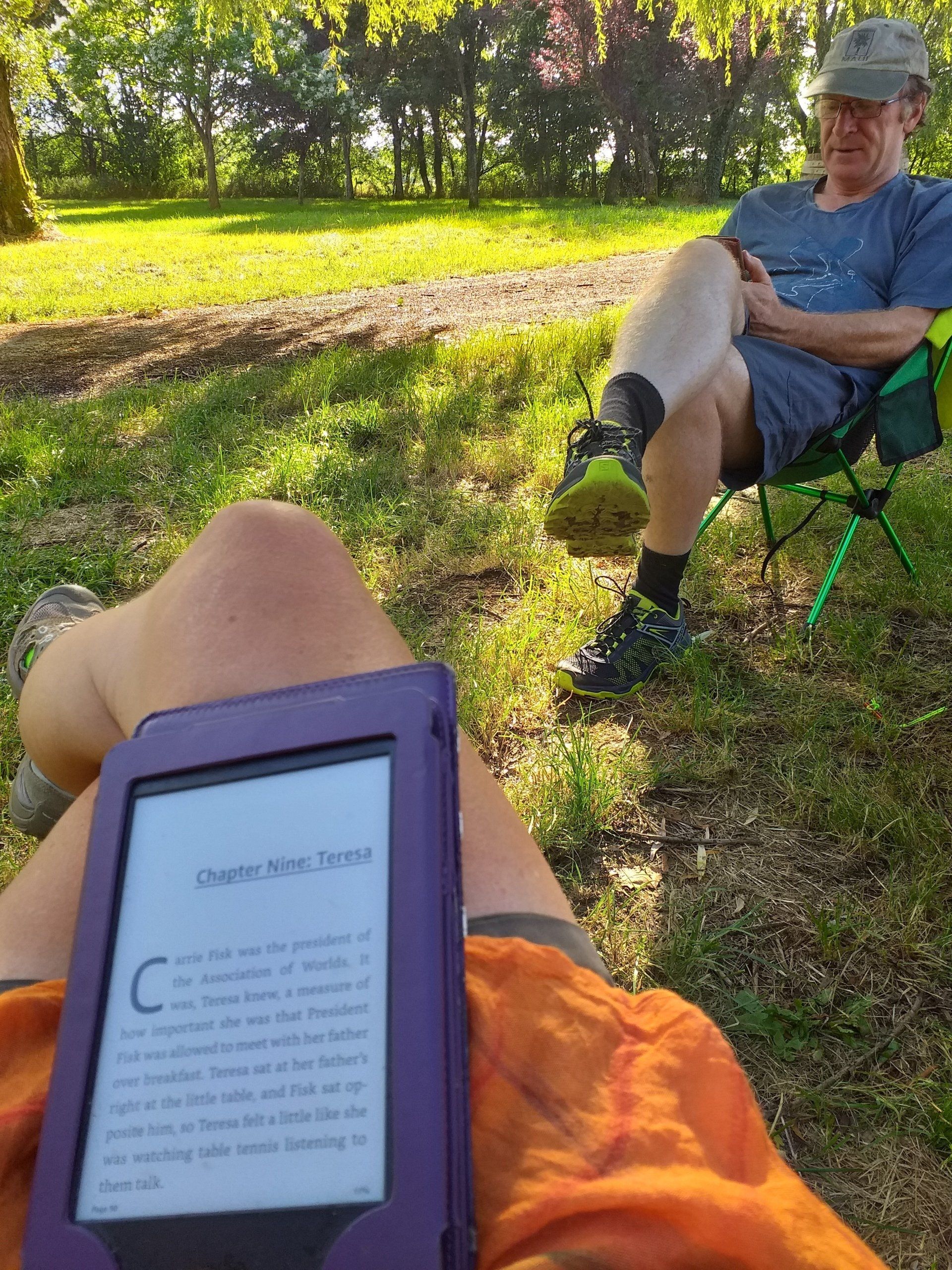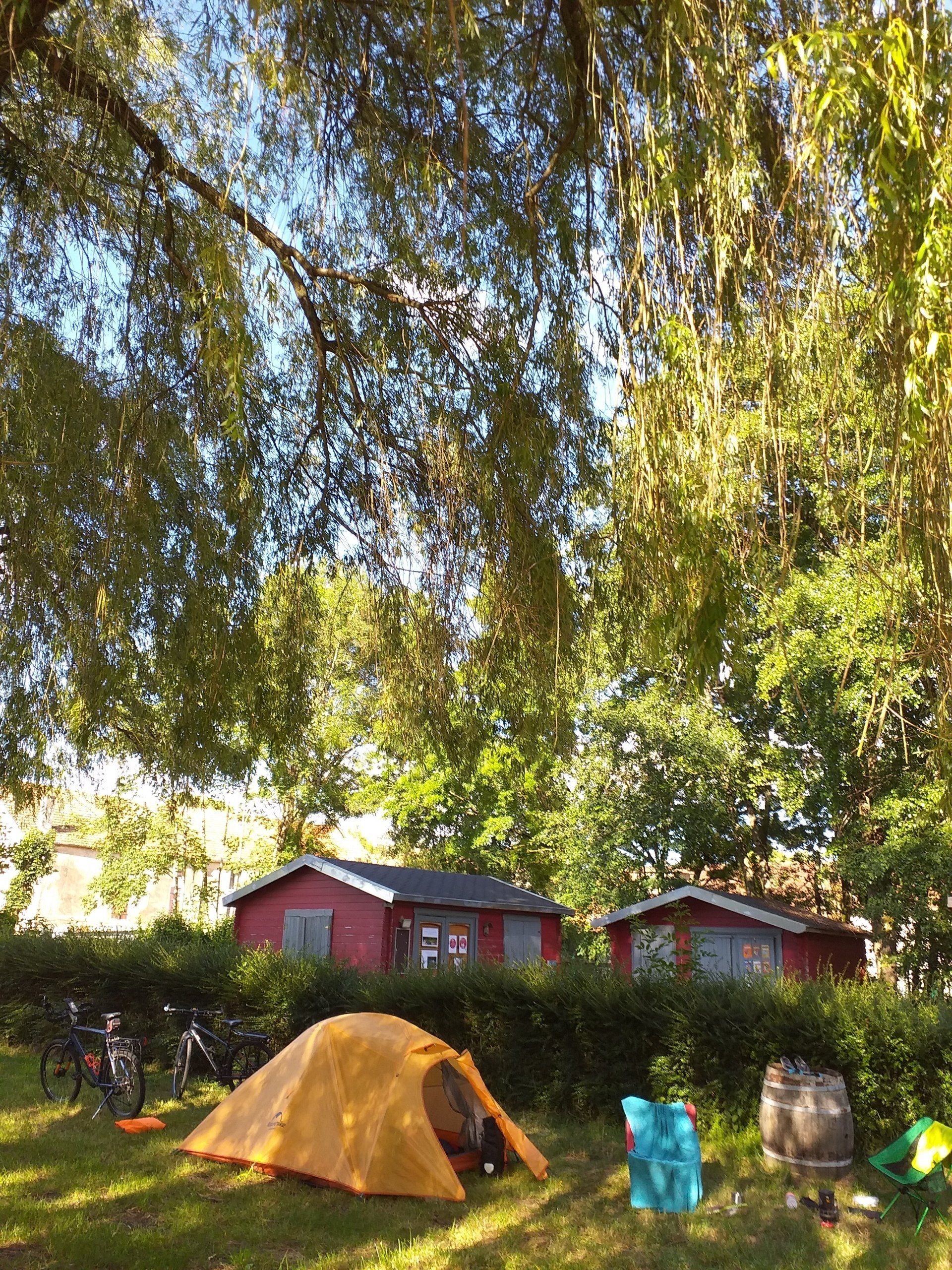 There will be no road noise tonight, but the frogs have already started to sing to us. We cook and eat tea on the picnic benches, the little café is not open on a Monday, so all is quiet. A family arrive and are disappointed the café is closed. They grin and shake their heads when Martin says